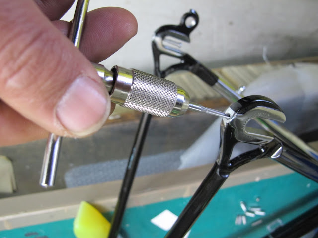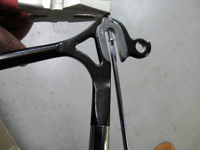 この小さなネジを入れてやらねばならない。 が、厚み8mmのカンパ鍛造のエンドに深さ14mmの小さなネジ穴が空いている・・しかも これが M3 という大きさのネジで直径3mm、穴自体は2.3mmしかない。分厚いメッキが穴の中まで付いてるから結構狭いときたもんだ。